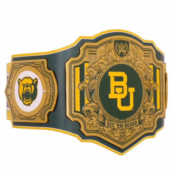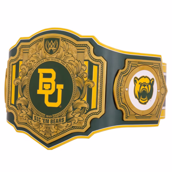 Show your Baylor Bears pride and WWE fandom simultaneously with this WWE Legacy Title Belt. This premium replica title celebrates the winning tradition of the Baylor Bears with bold team colors and logos emblazoned on the plates. It features a durable polyurethane strap, zinc alloy plates, and comes with a zippered cloth carrying bag. Display your allegiance and add this unique collectible to your Baylor Bears and WWE collection today!