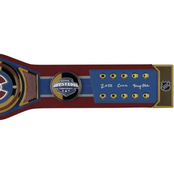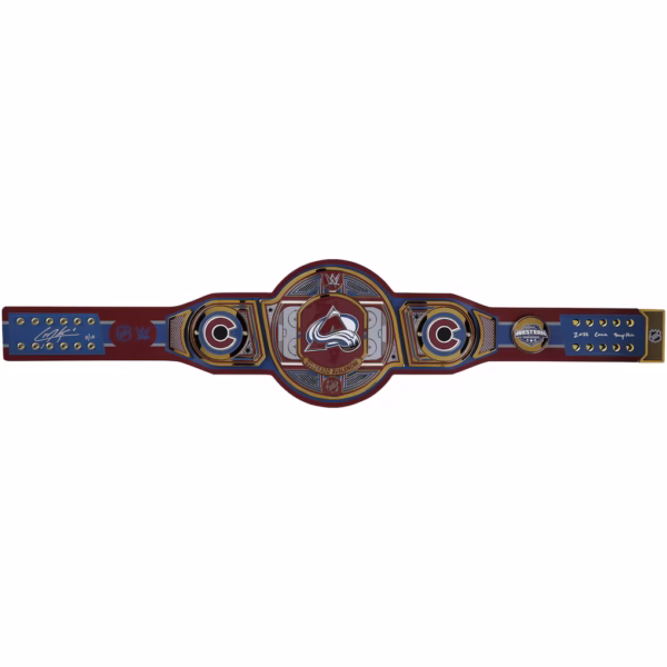 Elevate your collection of Colorado Avalanche memorabilia with this Cale Makar autographed WWE Legacy Title Belt. It features eye-catching team details and a distinct signature with “2022 Conn Smythe” inscription from the superstar defenseman. Additionally, this limited-edition WWE collectible includes an individually numbered, tamper-evident hologram that can be verified online to certify authenticity.